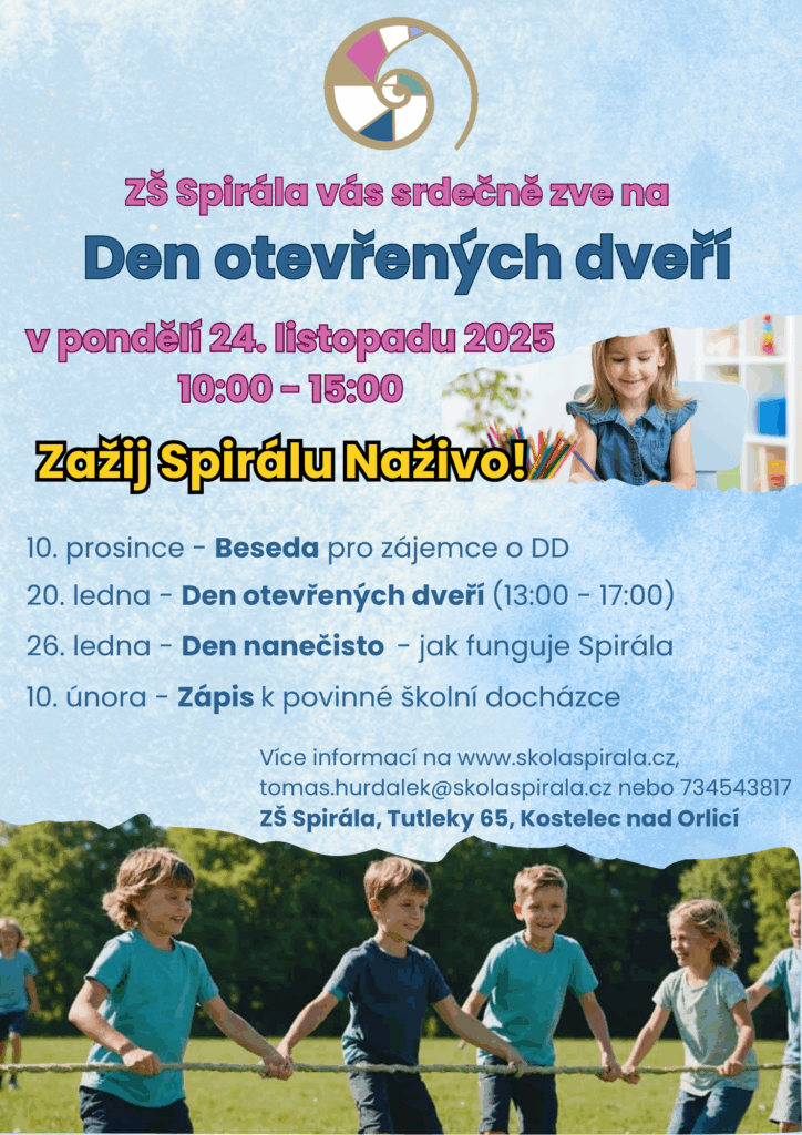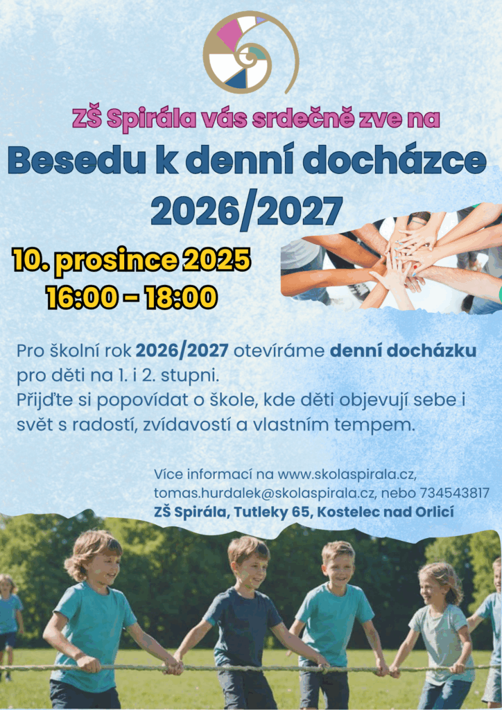 Milí příznivci Spirály, do světa hlásíme, že má naše škola nový kabátek! 🌀 Měníme logo a web, ale co zůstává, je náš záměr, aby Spirála byla takovým místem, kde panuje důvěra a bezpečný prostor pro vývoj dětí dle jejich potřeb. Místem, kde učení je přirozeným důsledkem hry, a kde děti mají možnost nalézt to, kým […]